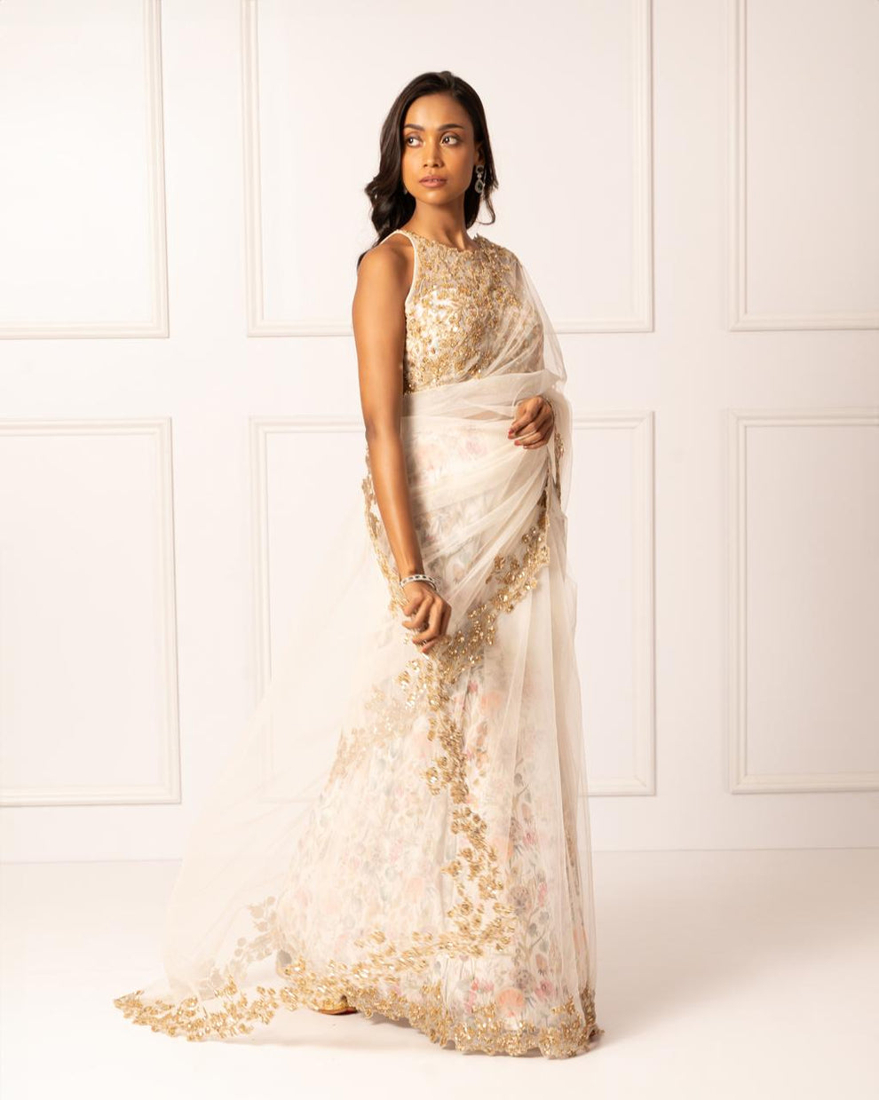 Pearl white saree set with embroidered border paired with printed skirt and embellished blouse