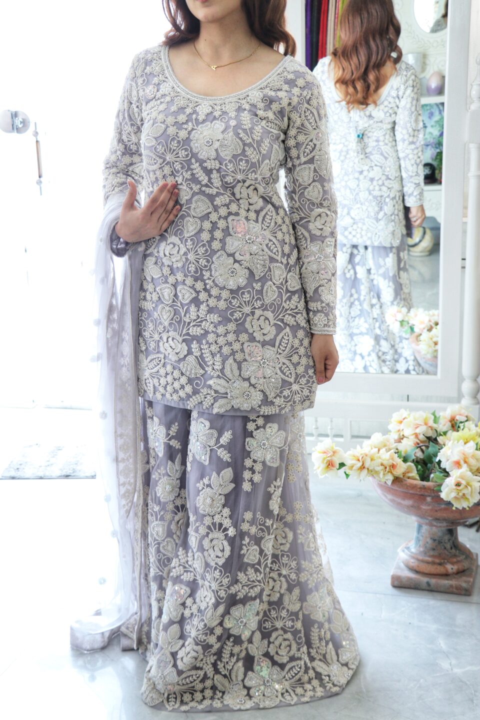 Mauve Grey Embroidered Sharara Set
