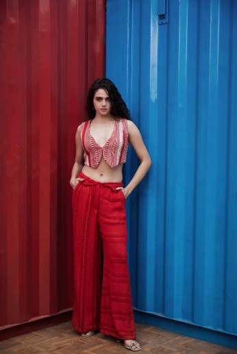 Summer gets a bold floral update with the CRUNK METALLIC BLUE JUTE SURFACING VEST SHIRT CO-ORD, a sheer pants is just one unique and versatile addition to your wardrobe.